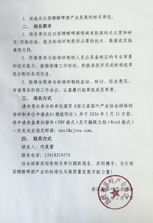各有关单位: 为适应快速发展的茶精酿啤酒市场,规范产品生产与品质,推动茶产业与啤酒酿造业的跨界融合与创新,促进新品类健康有序发展,经研究,浙江省茶叶产业协会已立项《茶精酿啤酒》(T/ZTIA0025-2026)团体标准(浙茶协【2026】2号)。 为确保标准的科学性、先进性和适用性,现面向社会公开征集标准研制工作参与单位,凝聚行业智慧,共同构建该新兴领域的标准基础。有关事项通知如下: 一、 征集范围 具备相关研究基础、技术实力和生产实践经验的单位均可申请,包括但不限于: 1. 从事茶叶深加工、茶食品研究的科研院所与高等院校; 2. 精酿啤酒生产企业、技术研发机构及行业协会; 3. 具备茶精酿啤酒产品开发与生产经验的食品饮料企业; 4. 从事食品质量安全检测、感官评价的第三方机构; 5. 其他关注茶精酿啤酒产业发展的相关单位。 二、 报名要求 1. 报名单位应对茶精酿啤酒领域有较高的关注度和研究/实践经验,能为标准研制提供必要的技术、数据或实践案例支持。 2. 所推荐参与标准研制的人员应具备相应的专业背景和技术能力,能够保障工作时间,积极承担并完成标准起草组分配的各项任务。 3. 能够全程参与标准研制的启动、研讨、征求意见、审查等各阶段工作会议,认真履行起草组成员职责。 三、 报名方式 请有意向参与的单位填写《浙江省茶叶产业协会团体标准研制单位申请表》(模板附后),并于2026年1月31日前,将申请表盖章扫描件(PDF格式)及可编辑文档(Word格式)一并发送至指定邮箱:hecl@zjtea.com。 四、 联系方式 联系人:何晨蕾 联系电话:15618214570 协会诚挚欢迎各相关单位踊跃报名,共同携手,为引领茶精酿啤酒产业的标准化与高质量发展贡献力量!